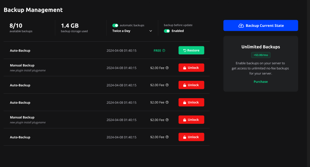 We’ve all had that one time when you place some TNT in your world and “by accident” it explodes. Sometimes you want to revert this, since the house you built does look better than a massive crater. This will also be supported at launch and will be standard on all servers we host. The screenshot below showcases an early concept of the backup storage. We are still in the stages of finalizing the backup system, so things might change. What will not change is that your latest backup(s) will remain free of charge and can be restored at any time.
