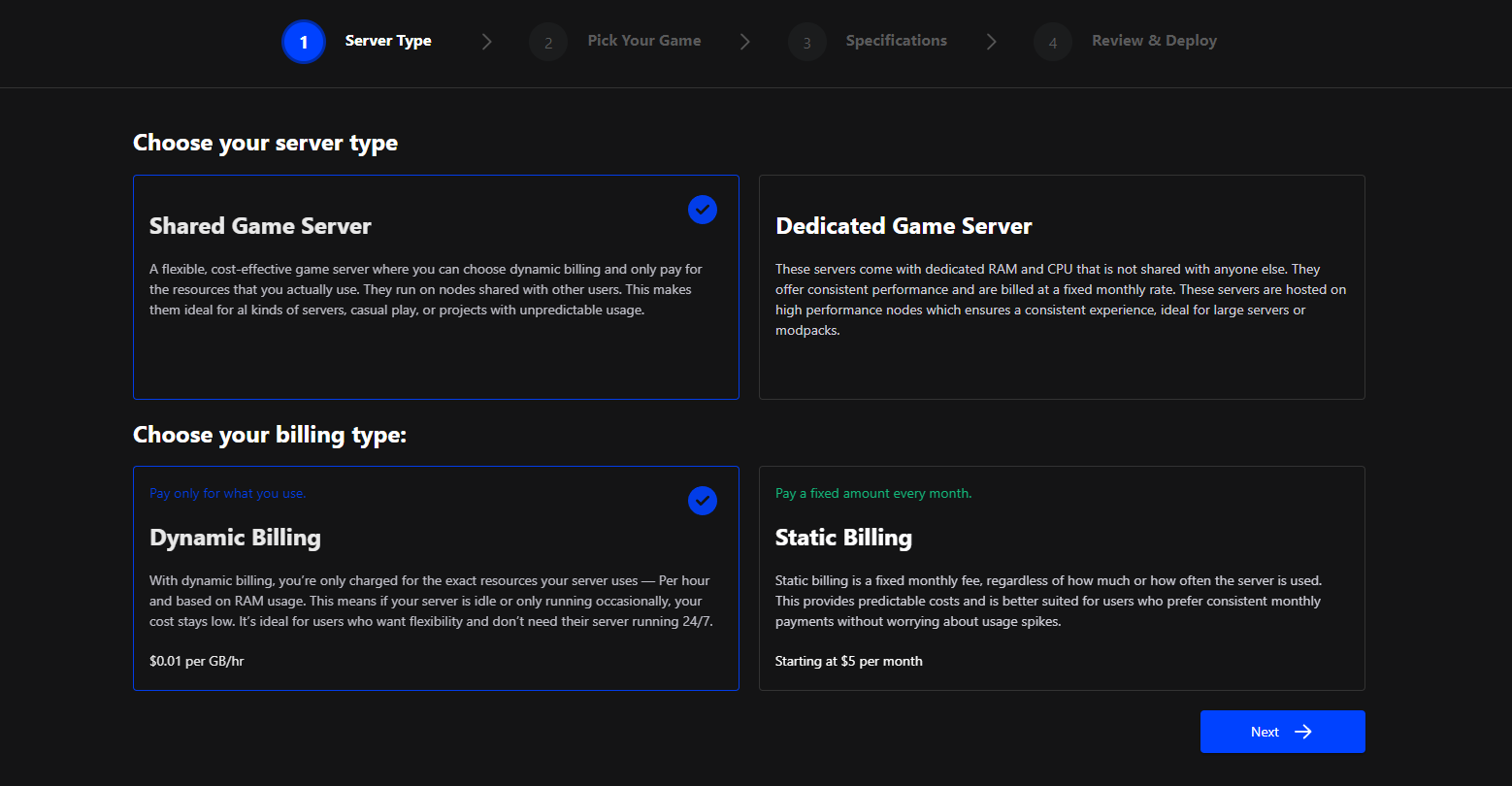 One of the most requested features during the alpha test was monthly subscriptions. We’ve listened and will support this option at launch in the form of Static Billing. When creating a new server, you will now have the option to select Dynamic Billing, which charges per hour only for the resources you use, or Static Billing. This type is what people are probably more familiar with from other hosting companies. Pricing is yet to be confirmed